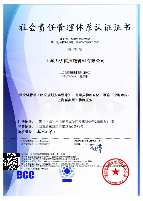 近期,无忧供应链顺利通过社会责任国际标准体系SA8000的全面审核,获得“SA8000社会责任管理体系认证证书”。这项荣誉不仅是对无忧供应链的充分肯定,也标志着公司在标准化管理、人文理念等方面符合并达到了SA8000社会责任标准的各项要求。