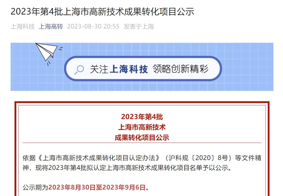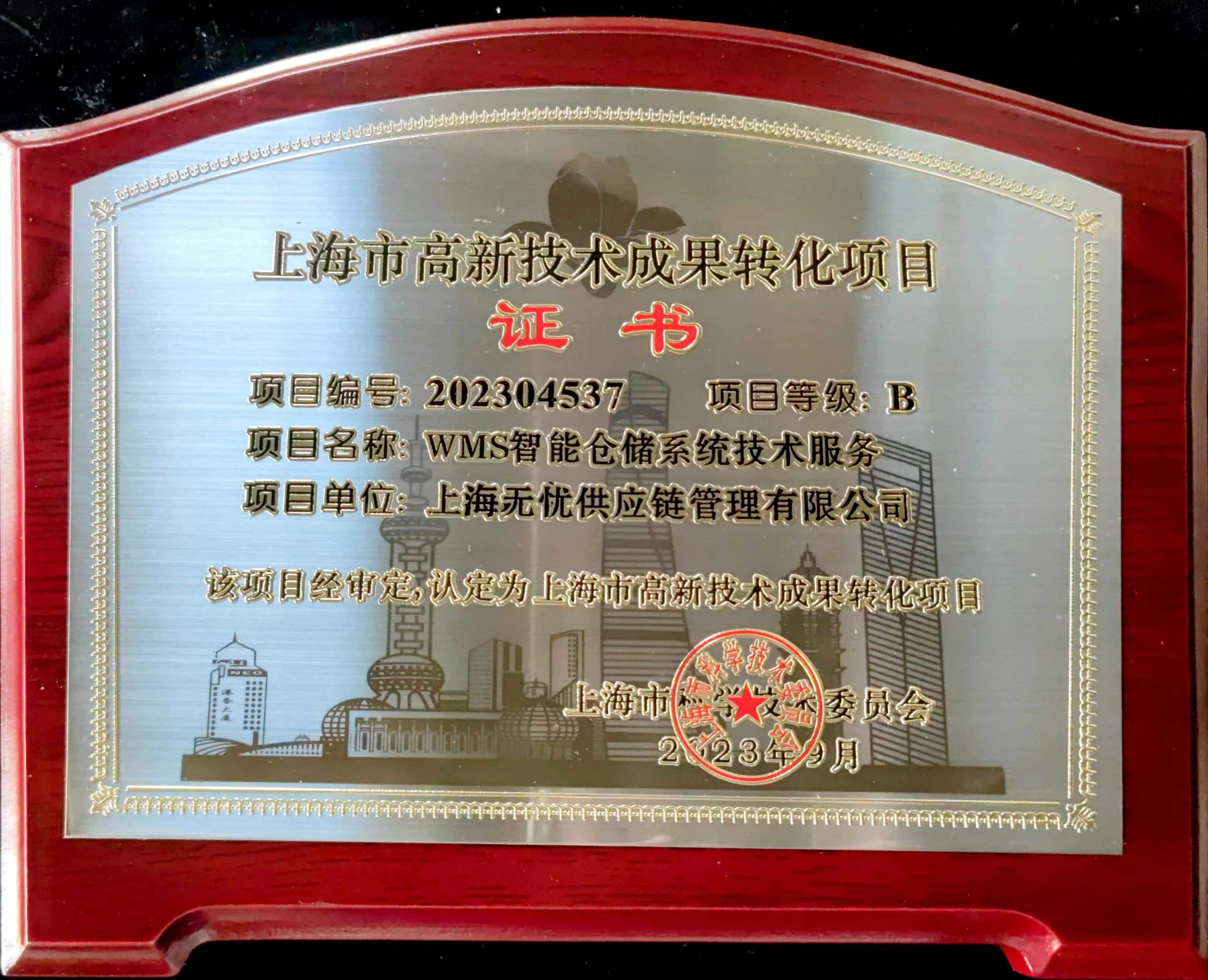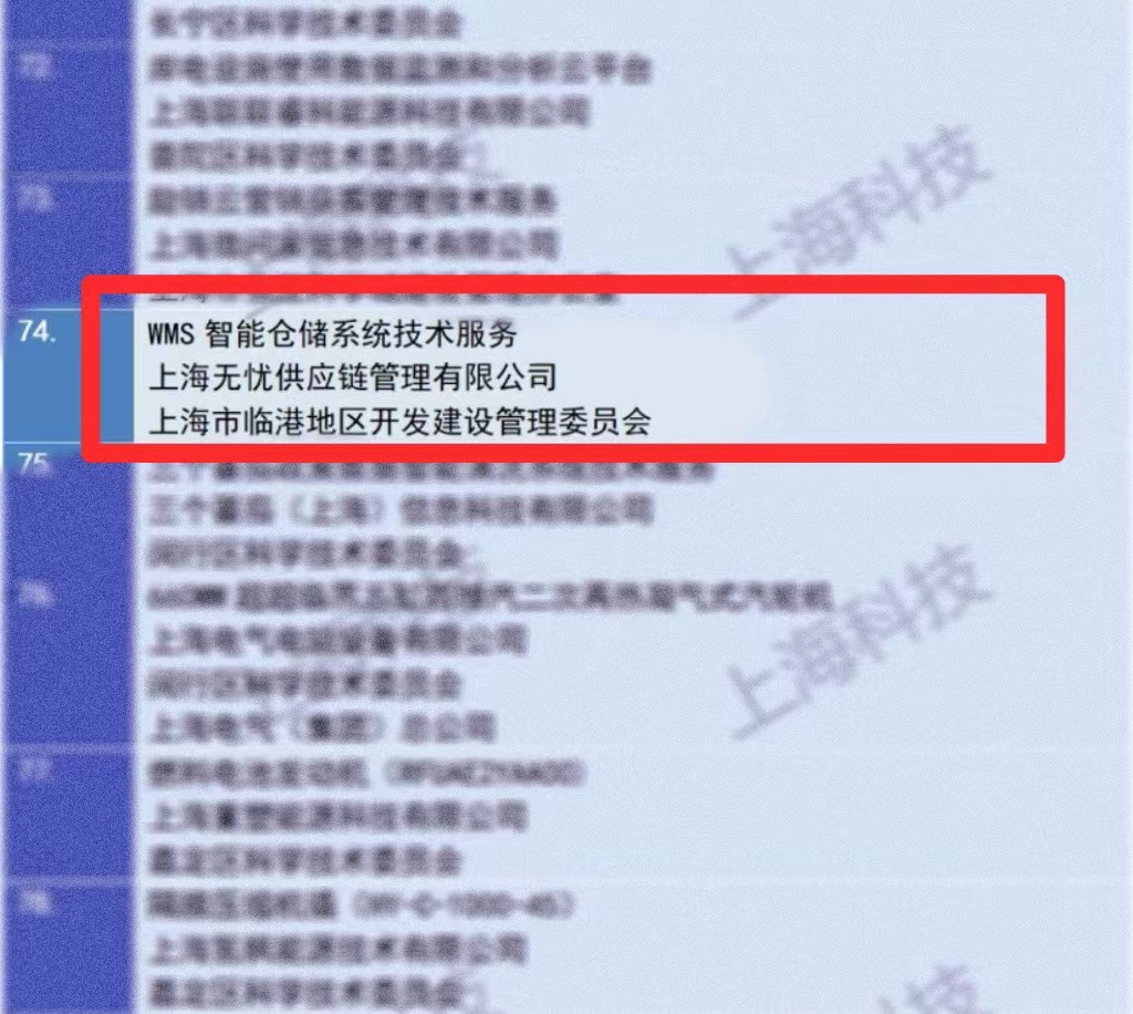 根据《上海市高新技术成果转化项目认定办法》(沪科规〔2020〕8号)要求,经受理审核、专家评审和社会公示等程序,认定上海无忧供应链管理有限公司的WMS智能仓储系统技术服务为2023年第4批上海市高新技术成果转化项目。